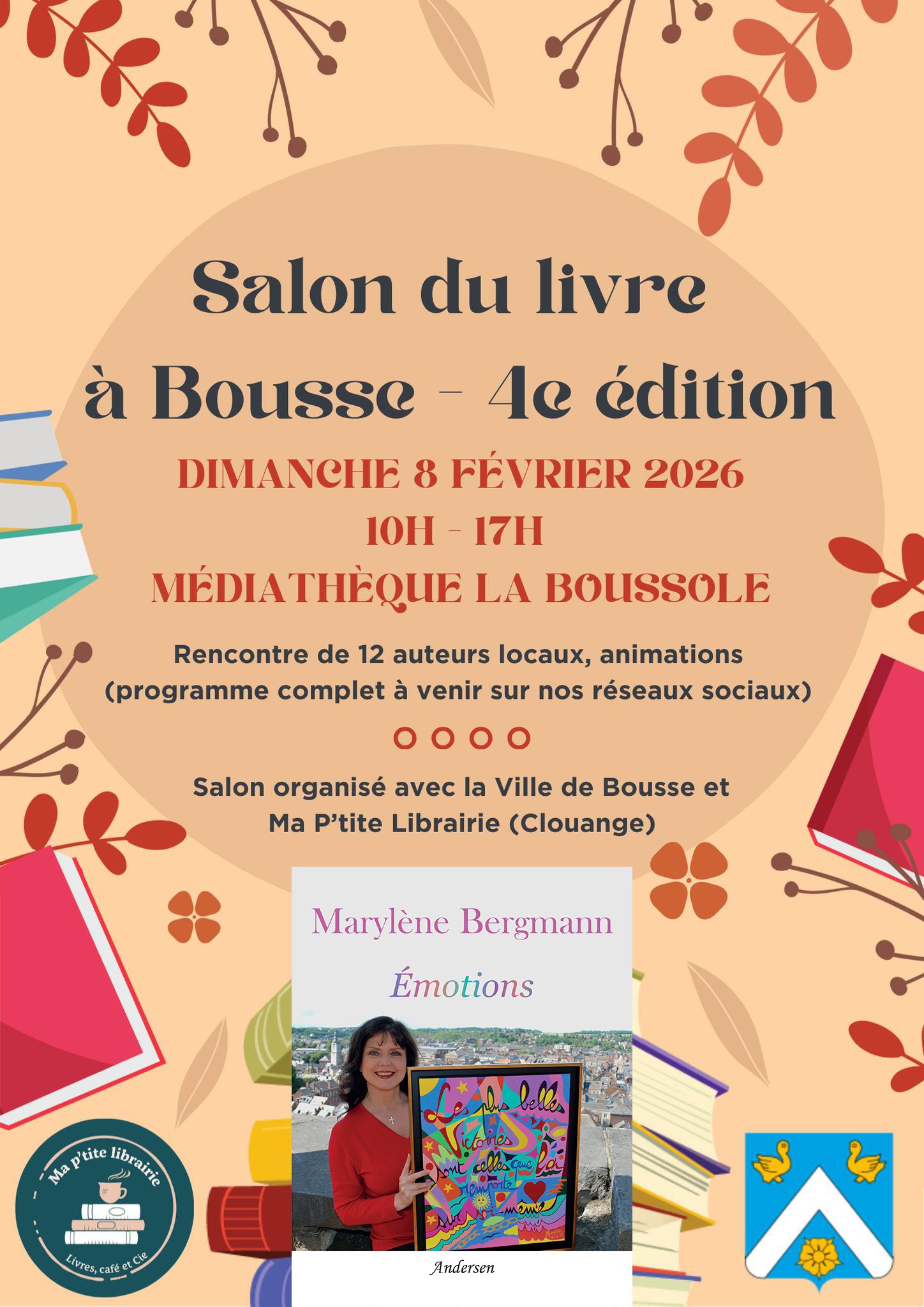 Dimanche 8 février | Rencontre à Bousse (57) | Marylène Bergmann dédicacera Émotions lors du salon du livre de Bousse (Moselle) qui aura lieu à la médiathèque La Boussole (2 place des Fêtes) de 10h à 17h.