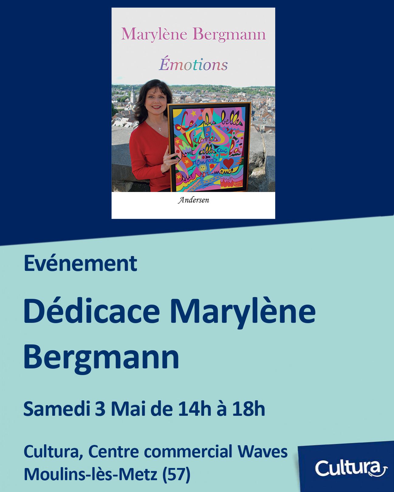 Samedi 3 mai | Rencontre | Marylène Bergmann dédicacera Émotions au magasin Cultura situé dans le centre commercial Waves de Moulins-lès-Metz (57) de 14h à 18h.