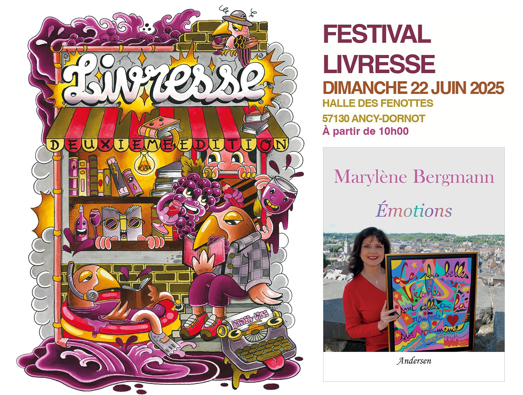 Dimanche 22 juin | Rencontre | Marylène Bergmann dédicacera Émotions lors du festival Livresse à Ancy-Dornot (Moselle) sous la Halle des Fenottes de 10h à 17h.