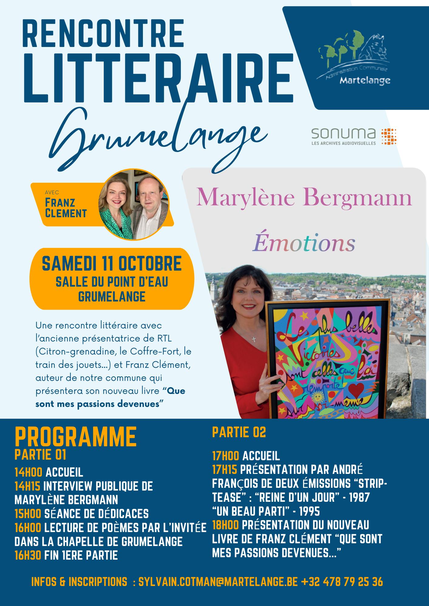Samedi 11 octobre | Rencontre | Marylène Bergmann rencontrera ses lecteurs et followers belges à Martelange-Grumelange (Belgique) (salle du Point d'eau) à partir de 14h. Interview publique de l'autrice à 14h15. Séance de dédicaces de son livre Émotions à 15h. Lecture de poèmes par Marylène dans la chapelle de Grumelange à 16h.