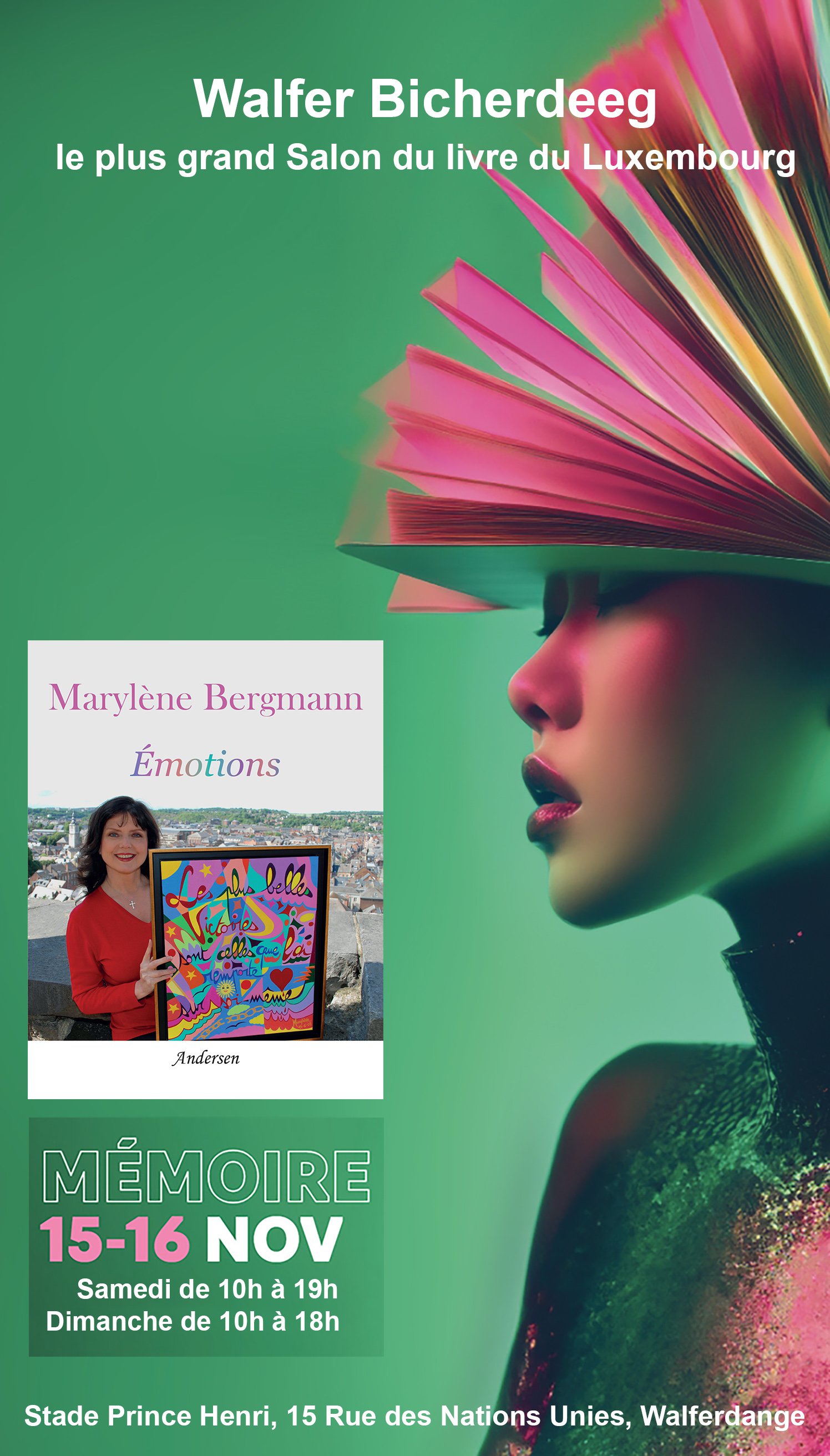 Samedi 15 & Dimanche 16 novembre | Rencontre | Marylène Bergmann dédicacera Émotions au salon du livre luxembourgeois Walfer Bicherdeeg à Walferdange (L-7270) le samedi de 10h à 19h et le dimanche de 10h à 18h (site du stade Prince Henri, 15 Rue des Nations Unies, Hall 2).